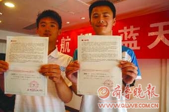 20日,全国民航招飞理科状元———青岛58中的薛斐(右)和东航山东分公司招飞文科状元———城阳一中的江世宁(左)展示刚收到的中国民航飞行学院的高考录取通知书。