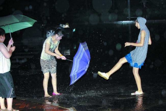 20日晚8时许,临沂市区迎来了一场强降雨,雨点瞬间从天而降,整个降雨过程大约持续了30分钟。图为几位市民正在雨中嬉戏。 记者 廖杰 摄影