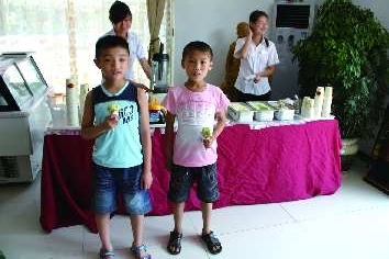 上午8点半,服务人员在接待中心准时摆放好设备、冰激凌及配料,等待客户的到来。随后,小朋友们在家长的带领下陆续来到接待中心,在服务人员的指导下DIY属于自己独一无二的冰激凌。