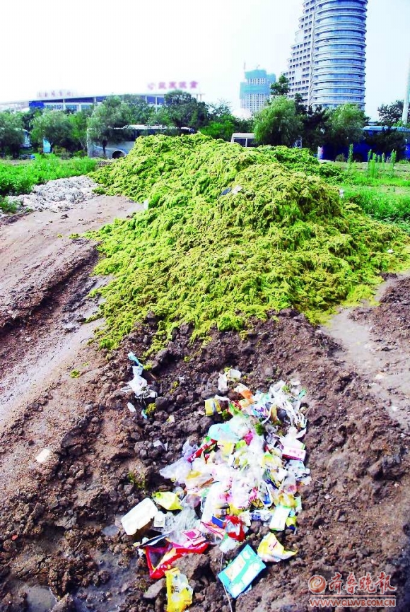 7月20日,在世帆基地西门左侧的一片荒地上堆积着一堆堆的浒苔,有的已经发白腐烂,气味刺鼻。浒苔堆旁边有两处浒苔填埋点,其中一处已经填满了浒苔,但是由于填埋不彻底,不少腐烂的浒苔露了出来。另一处填埋点里堆积着腐烂的浒苔,还没有填埋。浒苔腐烂后所发出的臭味能传很远,将不少来玩的游客熏跑。 本报记者 张照朋 侯健 摄影报道