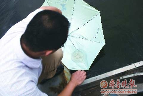 20日,在世帆赛基地内,一名游客用太阳伞捕捉水母。渔业部门介绍,连日的阴雨天,再加上水温比较适宜水母生长,水母数量有所增加。