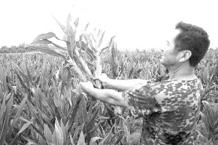 赵振忠从自己玉米地里拔出一棵玉米说:“你看看,叶子这么厚,和君子兰一样,根系不发达,而且玉米杆很粗,长的很矮。”