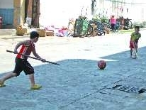 作品描述:两根竹棍加一个破篮球,两个小男孩于是玩起了一种新型运动———“直棍球”,真有创意。