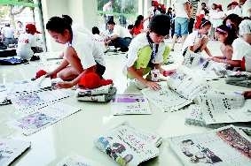 20日,在邮局大厅领到报纸的小选手们,开始组合报纸。只有用最少的时间组合完所有报纸,他们才能更早地走上街头卖报,也才能卖得更快。 本报记者 李军 摄