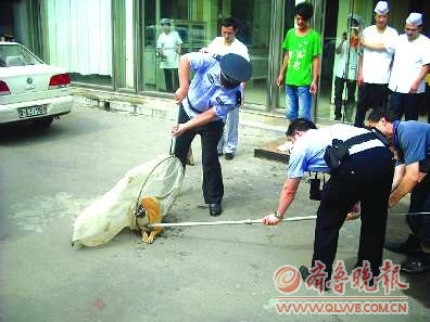 接到报警后,四里村派出所副所长肖磊带领民警迅速赶到现场,在经过一番斗智斗勇后,民警用专业的捕犬工具将恶犬制服。 本报记者 吴金彪 通讯员 杨晨 摄影报道