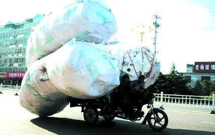 事件:一辆三轮摩托车载满塑料废品颤巍巍地行驶,驾驶员后面还又坐了一个妇女,十分危险。