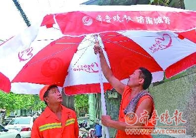 24日上午,本报记者和济南市城管局工作人员一起来到制锦市小区,将制作好的新伞送给正在工作的保洁员。记者看到,遮阳伞颜色主要为红色和白色,庄重大方,上面印有齐鲁晚报和济南市城管局字样。遮阳伞非常大,能把阳光完全挡在伞外,为保洁员撑起一片阴凉。