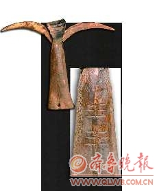 资料显示,苏昭杰收藏的这件獐牙钩形器,是迄今大汶口文化出土的100多件獐牙钩形器中唯一带卦符形符号的一件。这件獐牙钩形器高11.4厘米,由獐牙和鹿角质扁圆柄组成,上部左右嵌入獐牙,柄下端有穿孔,和常见的獐牙钩形器一致,不同处为柄的两面均有刻符。苏昭杰不知刻符有何意义,他请教了临沂市博物馆的李玉亭研究员,两人反复研究,觉得像八卦符号,但事关重大,不敢确定。