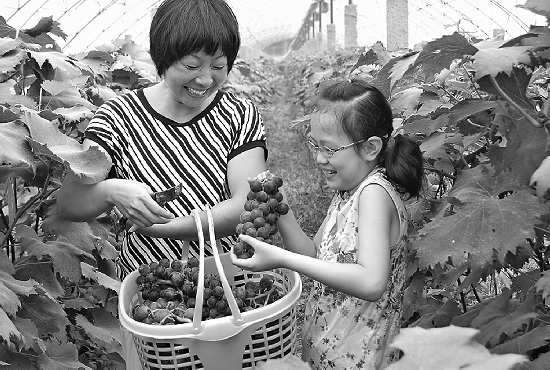 往年在“葡萄休闲之乡”任城区长沟镇,大量葡萄一般要到农历八月上旬才成熟,而今年从现在开始,长沟镇早熟优质葡萄就可以采摘了。长沟镇相关负责人介绍,这些早熟葡萄的上市时间是每年的6月中旬到9月下旬,直至长沟镇其他葡萄品种的上市,整个的采摘时间比原来延长了两个月。图为市民正在大棚里采摘葡萄。本报记者 马辉 本报通讯员 侯福战 王世友 摄影报道