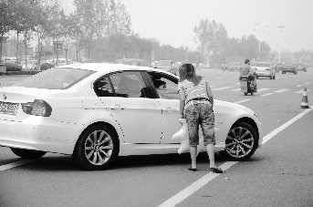 7月24日,在植物园附近的海曲东路路段上,不少商家走上马路拦车推销游泳圈、泳衣等商品。由于海边游客增多,不少商家直接将货架摆放到马路上叫卖,有的甚至拦车招揽游人购买。不少市民表示,这样不仅影响城市形象,更存在安全隐患。 本报记者 张照朋 摄影报道
