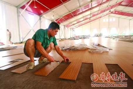 24日,在啤酒城,工人正在啤酒大棚内铺设木地板。据介绍,本届啤酒节的17个啤酒场馆已经搭建完毕,今年为了提升场馆档次,所有场馆首次铺设木地板。