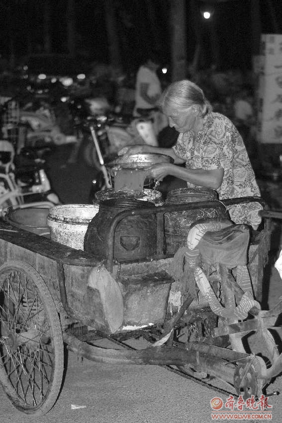 21日晚十点半左右,记者在太原路南段看到一位身形消瘦的老人,一点一点地将百余斤的大桶从三轮车上挪下来,将清汤倒出后,又把大桶搬回车上。看到老人这么大年纪还要如此操劳,本以为她举目无亲,她却告诉记者:“我有一个儿子四个女儿!就是没人管,儿子已经26年没和我说过一句话,女儿们也没怎么管过我。”