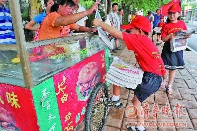 25日一早,夏日雨后空气格外清新,首批150名卖报童子军闪亮登场。“叔叔,买份报纸,献分爱心吧。”经十路与环山路路口附近,来自营东小学的6名卖报童子军拉开了本次报纸营销大赛的序幕,这些孩子来自同一个班级,开学后便将迈入小学三年级的门槛。“孩子平时赖着不起床,今天卖报,昨天晚上就激动得不行,早晨不到五点就起来了。”卖报童尚姝的妈妈感慨地告诉记者,一大早便骑着电动车从八里桥赶了过来,“孩子早饭没吃,卖起报来也不饿了。”