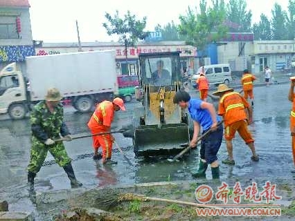 25日凌晨,市区下起大雨,历下城管及时启动防汛应急预案,清扫路面积水。截至早晨8点左右,全区所有道路全部清理完毕。图为历下工作人员在解放东路中段清淤。 通讯员 张昊宇 摄