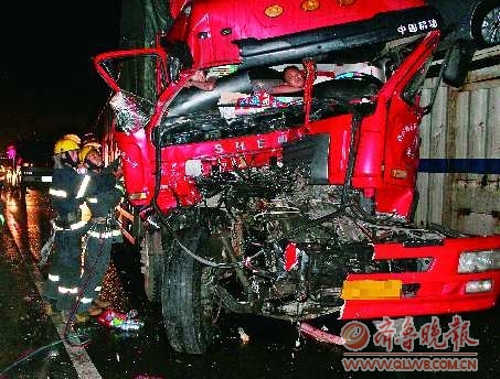 25日凌晨2时许,禹城市大雨倾盆,在京福高速公路371公里处两货车追尾,消防官兵冒雨前去救援,及时将货车司机与其同伴救出送往医院。