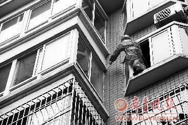 25日上午,家住市直小区的杨女士发现儿子住的房间窗外有个马蜂窝,遂报警求助。当天天气闷热,穿上防蜂服后,消防官兵汗流浃背。由于杨女士家住5楼且没有安装防盗网,消防官兵在身上拴上安全绳,探出窗外一举将蜂窝拿下。