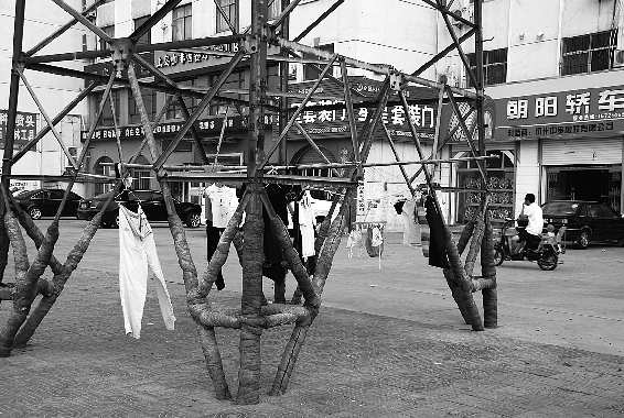 24日,在曹州路与黄河路西邻,几家商铺竟把刚刚洗好的衣服,晾在了高压电线杆下。记者看到,附近的居民把一些简易的晾衣绳跟竹竿搭放在电线杆的最底层,有的甚至直接把衣服挂在电线杆的铁框架上,不知道晾衣者有没有注意到电线杆上醒目的标志———高压危险。
