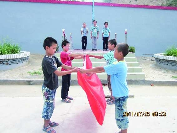 25日早上6时,支教大学生和孩子们早早地起床。他们排好整齐的队伍,等待唱国歌、升国旗。