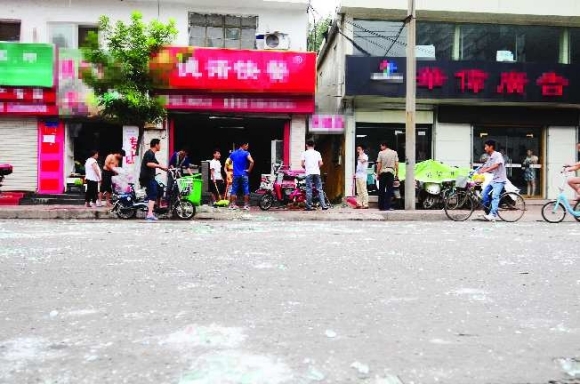 25日15时许,记者赶到位于新华路与启阳路交会处北100米左右的事发地,看到该快餐店门口的马路上全是玻璃碎渣,而该店铺的玻璃门已经全部破碎,隔壁的水果店也受到了不同程度的损坏。