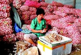 王中奎说,蒜种每亩地要400多斤,蒜种5元一斤,种蒜雇了4个工人,一天工资50元,种了三天,拔蒜薹雇了6个工人,干了两天,加上浇水施肥的成本,大约3500元左右。今年蒜薹1.7元一斤,一亩地产400斤,卖了680元,今年一亩地产干蒜大约2000多斤,按现在的批发价0.8元一斤,一亩地干蒜就卖1600元,一共卖2280元,一亩地赔1000多块钱。