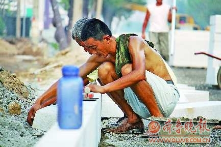 7月26日,天气闷热,人们行走在路上已明显感受到夏天的威力。在共青团路道路施工现场,施工人员褪去被汗水浸湿的上衣,仍难抵酷热,汗水不断从脸上滴落。 本报记者 马志勇 摄影报道