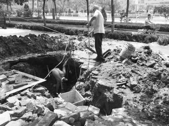 位于中通时代豪园二期门前的施工点时,两名工人正从长约3米、宽约1.5米、深约1.5米的坑里往外清淤泥,坑壁上仍不时有大块泥土掉下,坑底有近20公分深的积水。一位工人说:“这土太软,刚把坑里的清出来,旁边就塌下来一块,争取今天晚上干完。”
