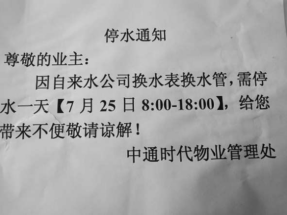 26日,记者在中通时代豪园二期看到,门岗处及住宅楼都贴了停水通知,停水时间7月25日8点至18点。小区居民赵女士说,通知周末就贴了,看到停水时间不长,她25日上午上班前就接了一桶水,中午做饭用了,本以为晚上能来水,没想到能停这么长时间。一位提着两饮料瓶水回家的老人说,停水前没看到通知家里没存水,只能出去借水。“这水留着洗刷用,不敢在家里上厕所,小区里没有公厕,上个厕所得跑老远。”