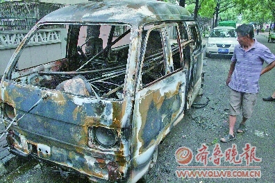 27日早上,舜玉北区一居民楼下,一辆面包车突然起火。尽管消防官兵随后赶来扑救,并从里面抢出一个煤气罐,不过面包车仍被烧得仅剩骨架。车主王先生介绍,一年多了,他一直将这辆破面包车当仓库,“电瓶什么的也拆了下来”,没想到却突然起火。