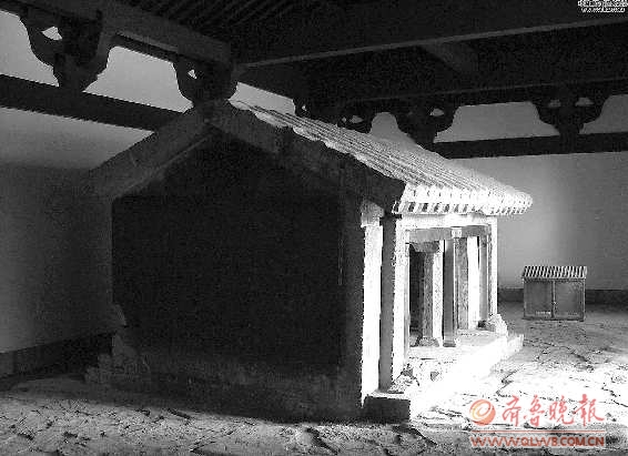 □田会银 曹丽丽 郭氏墓石祠的正面为长方形,东西长四米左右,南北宽两米有余,房子的正中间是一根八角石柱,将石祠分成东西两间。石祠的房顶是整块的厚石板材,而且房顶上雕刻着背脊、瓦陇、连檐等形状。