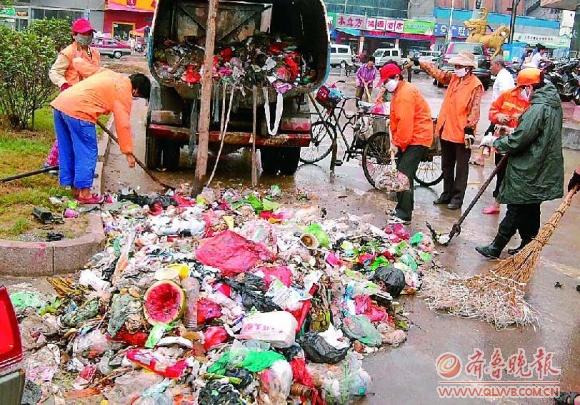 知情况后,市中区市容局紧急调来20多名环卫工人,用了3个小时才清理完毕。