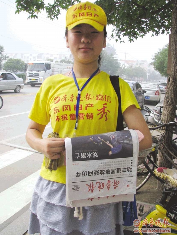 27日上午8点左右,记者在泰安二中附近见到了正在卖报的报童侯文杰。她背着蓝色的书包,胳膊上搭着几份报纸,见到行人就会急忙向前询问是否买报纸。由于天下着雨,记者看到,虽然侯文杰她手中撑着伞,但衣服依然湿透了。十几分钟后,看着手中只剩下几份报纸,不由得长长舒了口气。