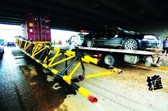 27日早7时许,在沂河路大桥桥东,一辆集装箱货车准备通过桥下时,将桥梁北侧限高架连根撞起,途经桥底的一辆黑色轿车被限高架砸中,司机受伤。图为轿车被运离现场。