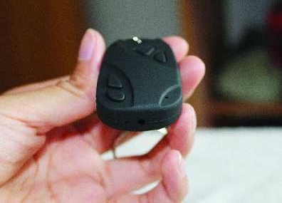 记者靠近一个柜台发现,柜台中摆了两款针孔摄像机,其中一种车钥匙形状的摄像机引起了记者的注意,从外观上看,它与普通汽车电子锁的遥控器几乎一样。“车钥匙”通体黑色,侧面有USB接口和内存卡插口。而“车钥匙”表面的4个按钮则只有两个可以使用,另外两个则是伪装。购买者根据需要放入内存卡,普通人很难从外观上判断出这是一款针孔摄像机。