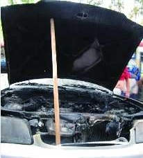 上午8点半左右,记者来到事故现场,发现一辆夏利车前盖被支起,前盖里面的零件已经烧的发黑,车前面的挡风玻璃也被烟熏黑,已经完全看不出这是一辆今年3月中旬购买的新车。