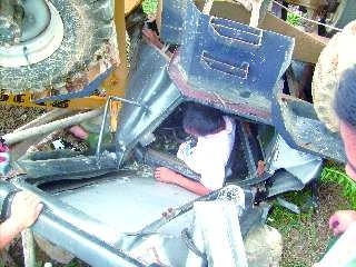 本报热线6610123消息(记者 钟建军 通讯员 王瑞国 张圣伟) 往山沟里倒石头,没想到这辆装石头的小型装载机也一头栽进山沟里,驾驶员被卡在车内。26日上午,蓬莱消防接到报警后,立即赶往现场,将被困司机从车内救出。