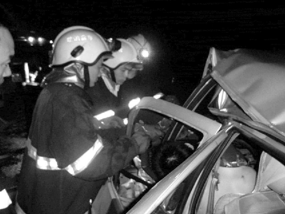 25日22时许,垦利县庐山路与北外环交叉口处,两辆轿车相撞,其中在一辆轿车中一名孕妇和一个孩子被困。东营消防支队六中队经过紧张救援,将被困人员救出,并与医务人员将被困人员送往医院。 本报通讯员 纪海涵 马云玲 张晓林 本报见习记者 闫西龙 摄影报道