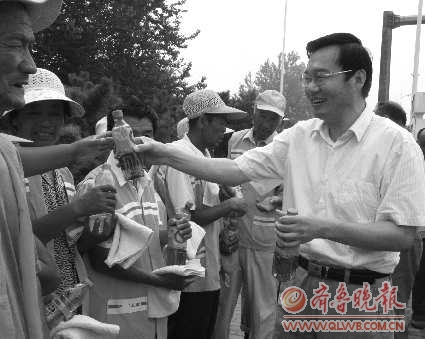 7月27日下午,尚龙江带领市城管执法局、市环卫处工作人员把数十箱矿泉水和饮料、毛巾等消暑用品,送到正在渤海十六路黄河八路工作的环卫工人手里,并详细询问了环卫工人高温期间工作的防暑措施和后勤服务保障现状,对不畏高温、坚持在一线辛勤工作的环卫工人表示感谢和慰问,同时叮嘱大家要注意身体。随后,尚龙江来到垃圾清运大队驻地,给那里的工作人员送去了西瓜。