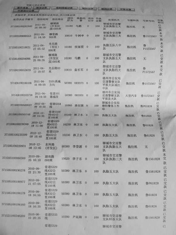 曾祥勇向记者提供的材料显示,他打印的6张违章记录从2007年到2011年,上面明确记载着违章编号、原因、执勤交警和罚款数额等内容,违章车辆类型基本都是拖拉机,曾祥勇和肖纯燕的驾驶证证号一样。