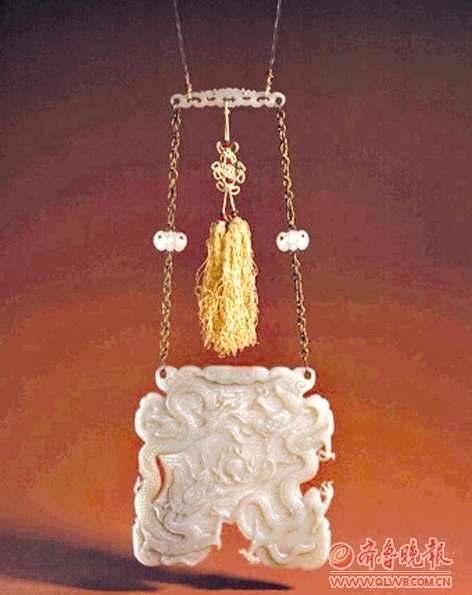 玉人物龙纹磬,明中期,长20.4cm,宽20.1cm,厚0.9cm。清宫旧藏。