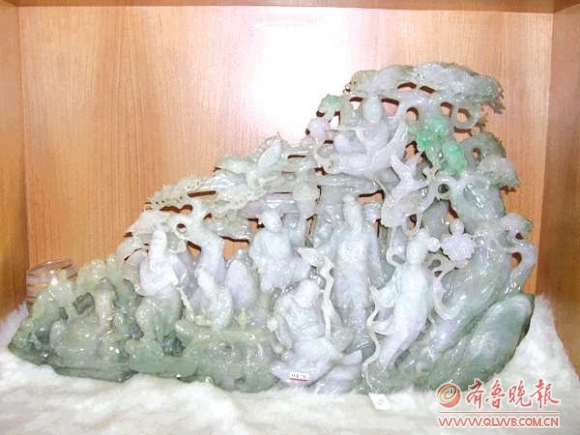 如图是一件造型精巧、工艺精细、气势宏大、形象生动的翡翠摆件,名为《八仙过海》。作品中的八仙姿态万千、神态各异,极具个性特征。他们使用各自法器横渡东海,欢声笑语引来了几只仙鹤,更增添了这一作品的吉祥意味。它将“中国渊源深邃的传奇文化与玉文化紧密结合”,寓意收藏者能够把握机遇、好运常伴、创造奇迹。