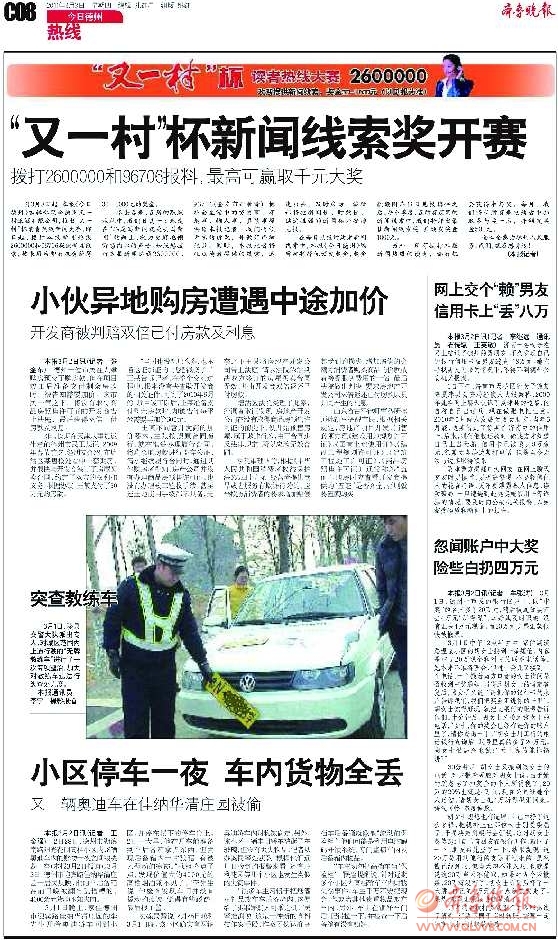 如果您拨打本报新闻热线2600000、96706(全省市话收费),把社会生活中的突发事、有趣事、恼人事、真情事提供给本报记者,本报记者将根据读者提供的线索,迅速出击,及时采访,编辑部将把新闻性、时效性、贴近性强的新闻稿件安排见报。自3月3日起,本报《今日德州》编辑部联合德州又一村酿酒有限公司,推出“又一村”杯读者热线新闻大赛。即日起,拨打本报新闻热线2600000和96706提供新闻线索,被采用后即有机会获得30—1000元的奖金。