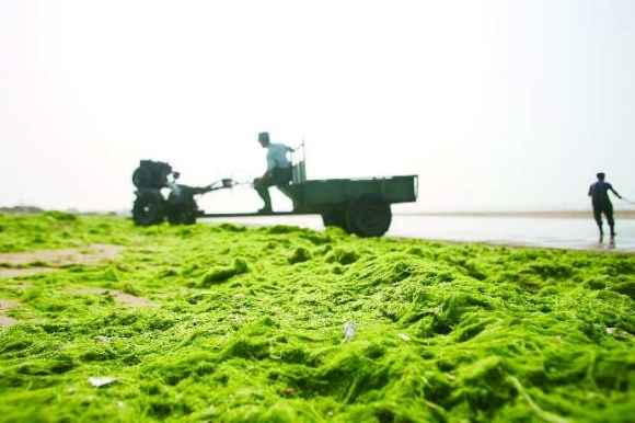 28日,海阳潮里村的沙滩上,拉船的拖拉机从浒苔上开过。当日,外出捕捞海蜇归来的渔民包明书告诉记者,逐渐增多的浒苔让他感到头疼,绿潮不仅把他下的两张海蜇网挂满,而且涌上岸边。他必须把带着浒苔的海蜇网一起埋在沙地里,等三五天浒苔腐烂了,再晒网才能继续使用。 本报记者 赵金阳 摄
