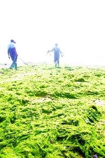 “我3天前在海里下了两张网,现在上面已经挂满了浒苔,简直就成了绿帘子,拎都拎不动。”包明书一边说一边将换下来的渔网挑到岸边抖动。