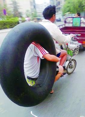 作品描述:这对父子同骑一辆电动车从游泳归来,儿子肩扛的巨大游泳圈成为街头一景。