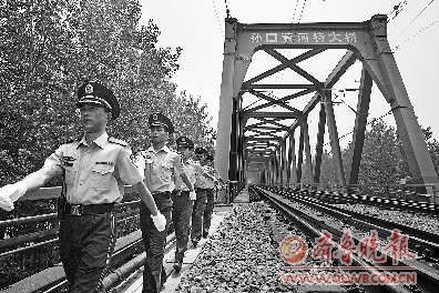 尽管起了个大早,由于距离偏远,当记者驱车赶到十二中队的营地时,时针已经指向了11点。在中队指导员王成的带领下,记者走上了铁路桥上仅有二尺宽的人行道,“在上面行走极其危险,火车驶过带起的气浪可以把人推倒。”王成说。与此同时,记者也强烈地感受到了滚滚的热浪,在上面走了不到两分钟,已经是汗流浃背。