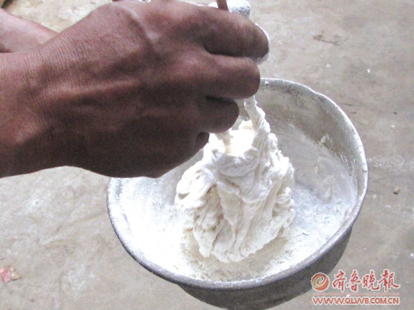 “小时候经常黏,现在忙起来没时间了,知了也少了,就很少黏了。”27日,家住范镇的韩建民一边和着面筋,一边说。他用白瓢瓢出二两白面,放入盛水的盆中不断揉搓。慢慢地,一盆清水变成了白水,韩建民倒掉盆里的水后又不断揉搓面团。如此反复几遍,白面中的淀粉被洗净,只剩下了浅黄色的面筋。