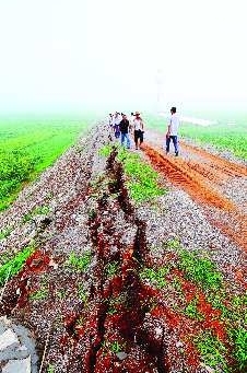 28日上午,记者来到平邑县仲村镇南大支坡村,顺着村里的主干道来到村子南面的田地,一座高架桥跨过一条铁路上方,连接起南北两片田地。记者看到,高架桥的坡度有40多度,道路两侧已出现了裂缝,用水泥、石头砌成的护坡,也出现了不同程度塌陷。