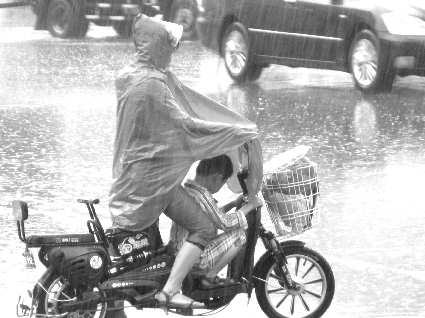 事件:大雨中,一位母亲冒雨骑着电动车,雨披下仅有的空间,成了孩子避风的港湾。