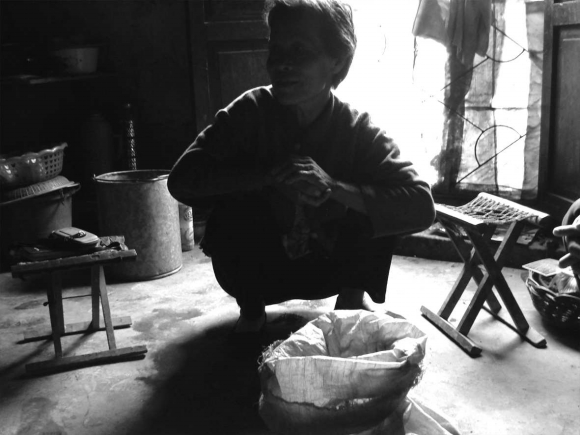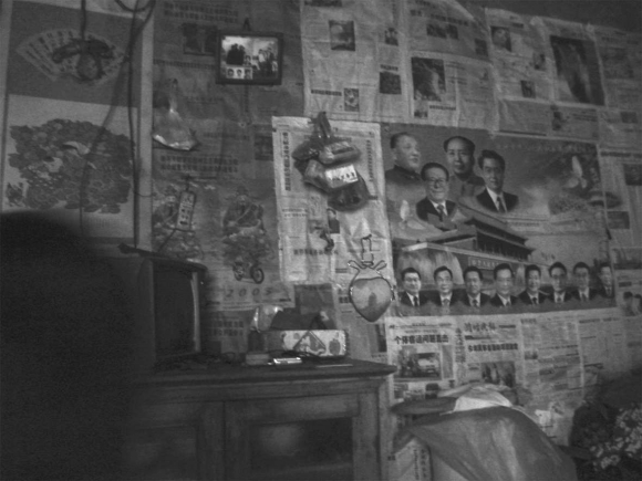 进入屋中,光线很是暗淡。环视房屋一周,墙壁上贴满了报纸和字画,床铺、水缸、炉子等一切家什都拥挤在三间小屋内,家中唯一值钱的物件就是那台12寸的黑白电视机,而且仅能收一个台。