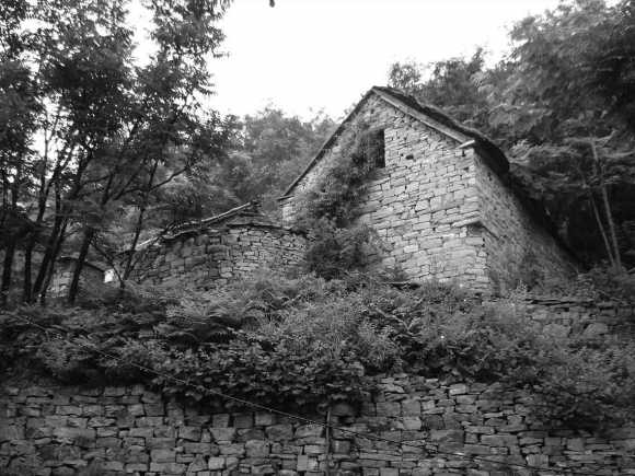 在老人的指引下,绕村一圈,道路没有一条宽度超过1米的,村子里有十多处石屋,不少石屋的屋顶还是用麦秸搭建的,经过长年的风吹日晒雨淋,村中三四处房屋已经坍塌。“村子里的人都快走光了,房顶塌了的,都是很长时间没人住的。”彭先收在雨中戴着斗笠望着坍塌的老屋子神情很是沉重。